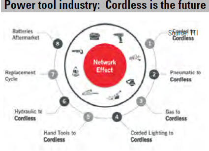 As a leader in the field of cordless tools, TTI continues to gain market share, especially in the under-penetrated professional segment (cordless: 30-40%).