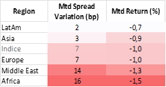e most affected region (+16bp), followed, unsurprisingly, by the Middle East (+14bp). Latin America and Asia have remained broadly unchanged (+2bp and +3bp respectively), while Europe has widened in line with the index. The 1% market decline is primarily attributable to the rates component (-0.6%) and concerns over a renewed inflationary shock, rather than to the credit component (-0.4%). The appreciation of the US dollar, typical during periods of risk aversion, has particularly impacted the localcurrency emerging debt market, which corrected by 2.9%.