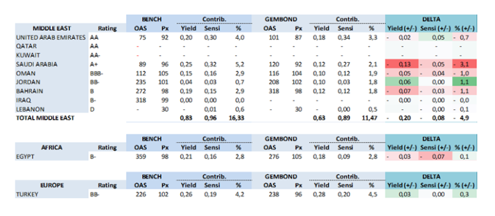 Within the Middle East, the widening of sovereign risk premiums has followed the hierarchy of credit ratings, with a marked underperformance from Lebanon (+106bp) and Iraq (+68bp), followed to a lesser extent by Bahrain (+22bp) and Jordan (+15bp). The Sultanate of Oman, owing to its lower exposure to hydrocarbons and its historically neutral political stance in the region, has been the least affected (+6bp). Saudi Arabia and the United Arab Emirates have widened by 10bp. Qatar and Kuwait, which exited the index after being reclassified as developed countries, have widened by 8bp and 20bp, respectively. Performance figures, reflecting each country’s average duration, show greater resilience in Lebanon (-0.3%) and Iraq (-0.8%).