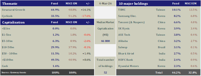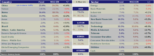 See below GemEquity’s geographical and sector breakdown as of March 4th 2026 :