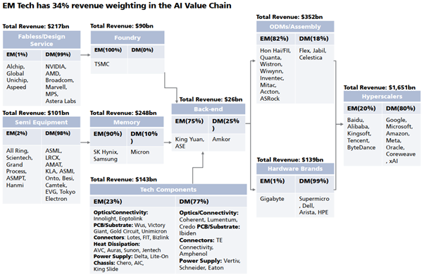 En mars 2024, au cours de notre précédente visite à Taïwan, on s'était concentré sur un seul thème : comment l'intelligence artificielle (IA) allait remodeler l'économie mondiale, et le rôle de TSMC en tant qu'acteur clé dans la fabrication de puces de haute performance (HPC) développées par Nvidia, AMD et Broadcom. Deux ans plus tard, cette hypothèse a gagné en crédibilité : les 4 principaux hyperscalers (Google, Amazon, Microsoft et Meta) ont augmenté leurs dépenses d'investissement dans l'IA, passant de 200Md$ en 2024 à 620Md$ en 2025. Pendant notre visite à Hong Kong, des inquiétudes ont été soulevées concernant un éventuel pic des dépenses d'investissement des hyper-scalers américains. Le stratègiste mondial de Jefferies a identifié 3 principaux risques : les doutes possibles des actionnaires des hyperscalers américains sur le retour sur investissement des dépenses en IA ; les contraintes en matière de production d'électricité aux États-Unis entraînant des retards dans la construction des data centers et la hausse des spreads des swaps de défaut sur Oracle et Core Weave (hyper-scalers de niveau 2). Cependant, sur le terrain à Taipei, la situation était très différente. Toutes les entreprises que nous avons rencontrées dans la chaîne d’approvisionnement de l’IA – fournisseurs de boîtiers, fabricants d’équipements et concepteurs de puces – nous ont transmis le même message : « La demande de puces haute performance accélère, mais l’offre reste structurellement limitée, et en plus, la complexité de production nécessaire pour répondre à cette demande continue d’augmenter». Nous attribuons cette confiance dans la chaîne d'approvisionnement aux signaux provenant directement de TSMC. L'entreprise a augmenté son plan d'investissements (capex) de 30 à 40%, le portant à 52-56Md$ en 2026, avec ~20% dédiés aux infrastructures de back-end. L'augmentation de l'allocation au back-end refléte le déplacement du point de blocage : de la fabrication front-end vers le packaging des puces HPC. Les nodes avancés de TSMC (2 et 3 nm) devrait atteindre des taux d’utilisation de 100% et 120% au 4T26. La capacité de packaging avancé CoWoS est déjà vendue avant même le début de la production et sera augmentée de 70 000 plaquettes/mois (4T25) à 170 000 plaquettes/mois (4T27). Même avec cette capacité accrue, les experts du secteur indiquent que la demande devrait toujours excéder l'offre de 15 à 20%. Dans ce contexte, nous ne sommes pas surpris que TSMC annonce des dépenses d'investissement supplémentaires, portant le total à 65-70 Md$ en 2027.