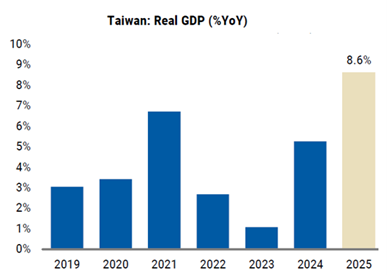 Le contexte macroéconomique de Taïwan reflète clairement le boom de l'IA. Le PIB réel a progressé de 12,7% en glissement annuel, grâce aux exportations qui ont augmenté de 38% sur la même période, ce qui reflète une demande plus forte que prévu dans le secteur des semi-conducteurs et des produits informatiques liés à l'IA. La demande intérieure s'est aussi améliorée : +3,4% pour la consommation privée en glissement annuel. En 2025, la croissance du PIB de Taïwan a été la plus forte depuis dix ans, à 8,6%, bien supérieure au taux de croissance structurel de 3%. Parallèlement, l'inflation de février 2026 a atteint son plus haut niveau depuis 10 mois, à 1,8%, sous l'effet des pressions liées à l'approvisionnement énergétique. Taïwan s'approvisionne à 80% en pétrole et à 33% en gaz au Moyen-Orient, ce qui devra être surveillé compte tenu du conflit avec l'Iran. Les stocks actuels s'élèvent à 100 jours pour le pétrole et 11 jours pour le GNL.