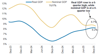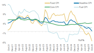 Anche l'inflazione continua a sorprendere al ribasso, con l'IPC di ottobre attestato allo 0,25%, mentre continuano a calare i prezzi dei prodotti alimentari e delle commodities. La RBI ha ulteriormente allentato il tasso di riferimento di 25 pb portandolo al 5,25%. Dall'inizio del 2025, l'India ha tagliato i tassi di riferimento di 125 punti base e rivisto le sue previsioni di inflazione complessiva (CPI) al ribasso, dal 2,6% al 2% per l'anno fiscale 2025/26. Ad ogni modo, la rupia indiana ha perso il 10% circa nel 2025 in termini effettivi nominali a causa dell'aumento del deficit commerciale (legato soprattutto all'aumento delle importazioni di oro), alla debolezza dei flussi di IDE e degli investimenti di portafoglio esteri, nonché alle incertezze che pesano su un possibile accordo commerciale con gli Stati Uniti.